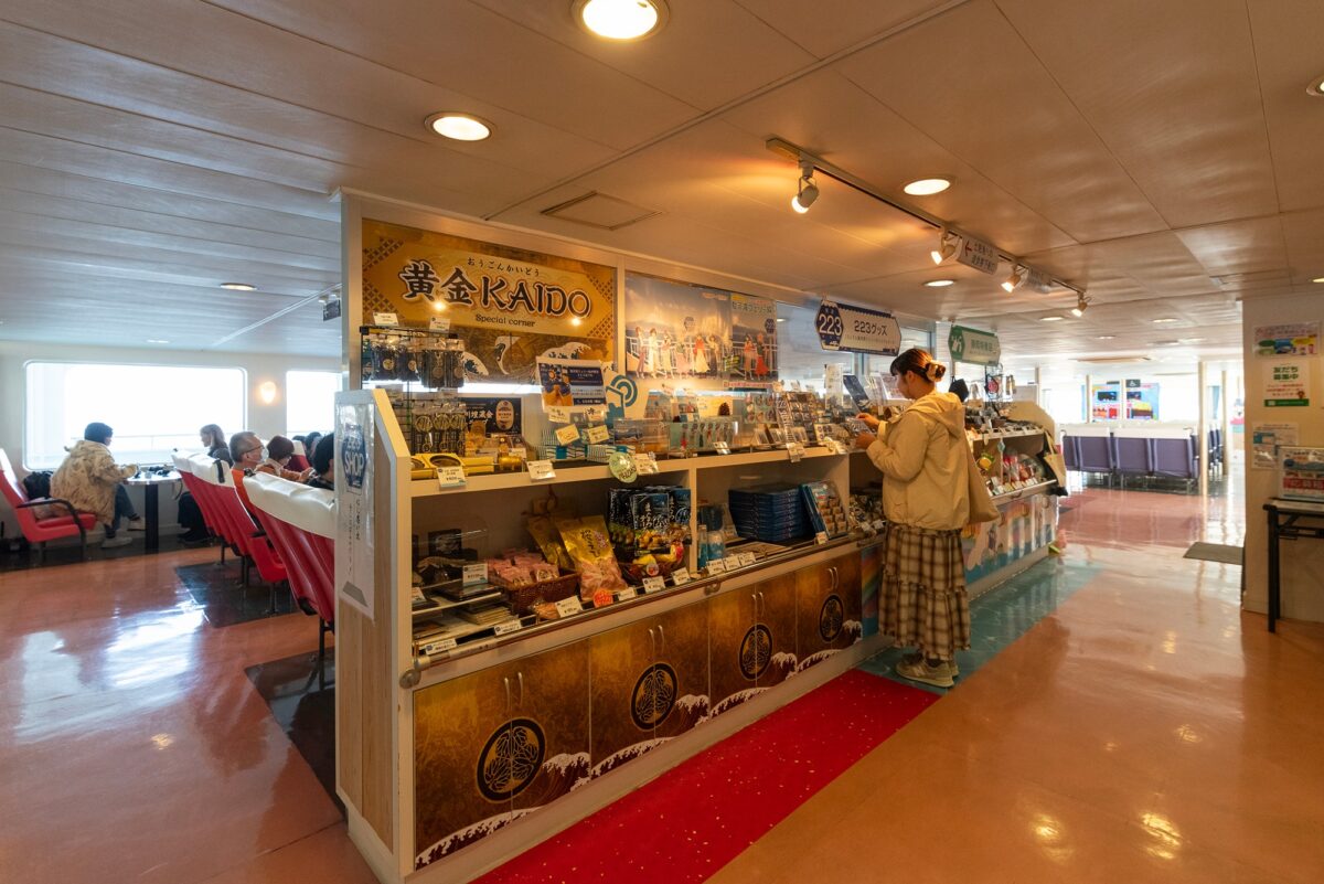 船内には軽食やおみやげを販売する売店「フェリーズカフェ」があります。小腹が空いたら、デッキへ。たこ焼きや223焼き(大判焼き)など、熱々出来たてグルメを販売する屋台がありますよ。