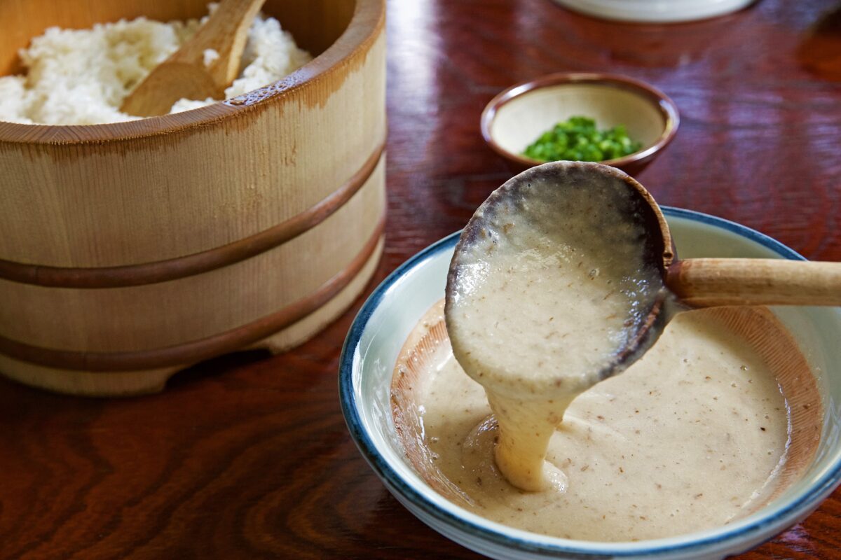 自然薯をすりおろし、だし汁やみそ汁でのばしたものを麦飯にかけていただきます。