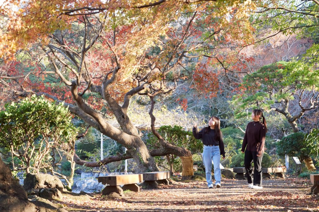 「楽寿園」は国の天然記念物及び名勝に指定された広大な庭園。湧水の湧く小浜池やせりの背などの天然池泉があり、自然林に囲まれた遊歩道を散策