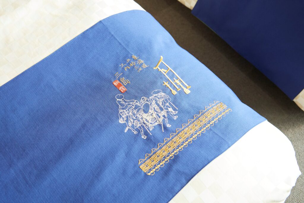 歌川広重の浮世絵「三島 朝霧」の刺繍がベッドスローに