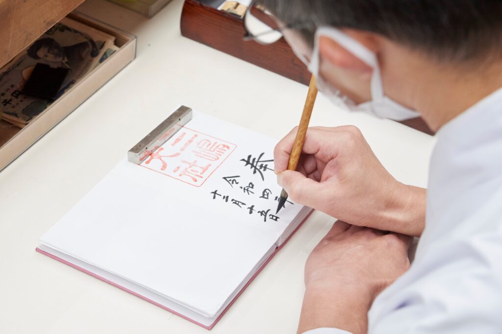 神社印が大きい!神門手前の左手にある客殿が受付場所
