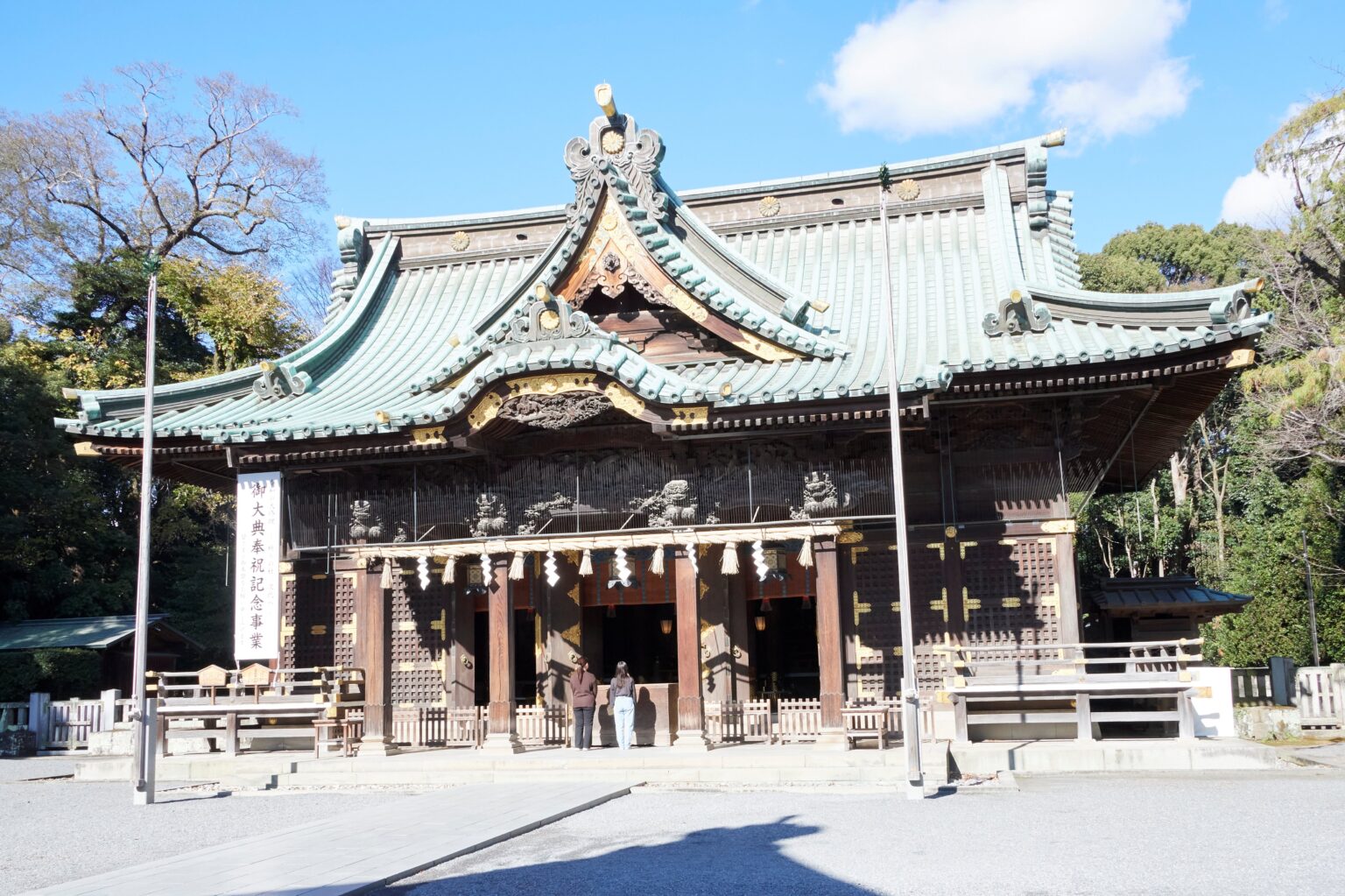 江戸時代末期の装飾が施され、厳かな雰囲気の本殿。手前に幣殿・拝殿、奥には本殿があり、3つの建物が連なる複合社殿建築は国の重要文化財