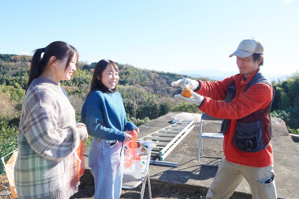 みかん狩りのシーズンは10月~12月。日当たりの良い場所で育った、小ぶりで色が濃いものを探して収穫。1kgのみかんがお土産に付きます
