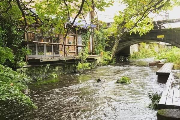 春は桜、初夏はアジサイが楽しめる源兵衛川の遊歩道がカフェの目の前