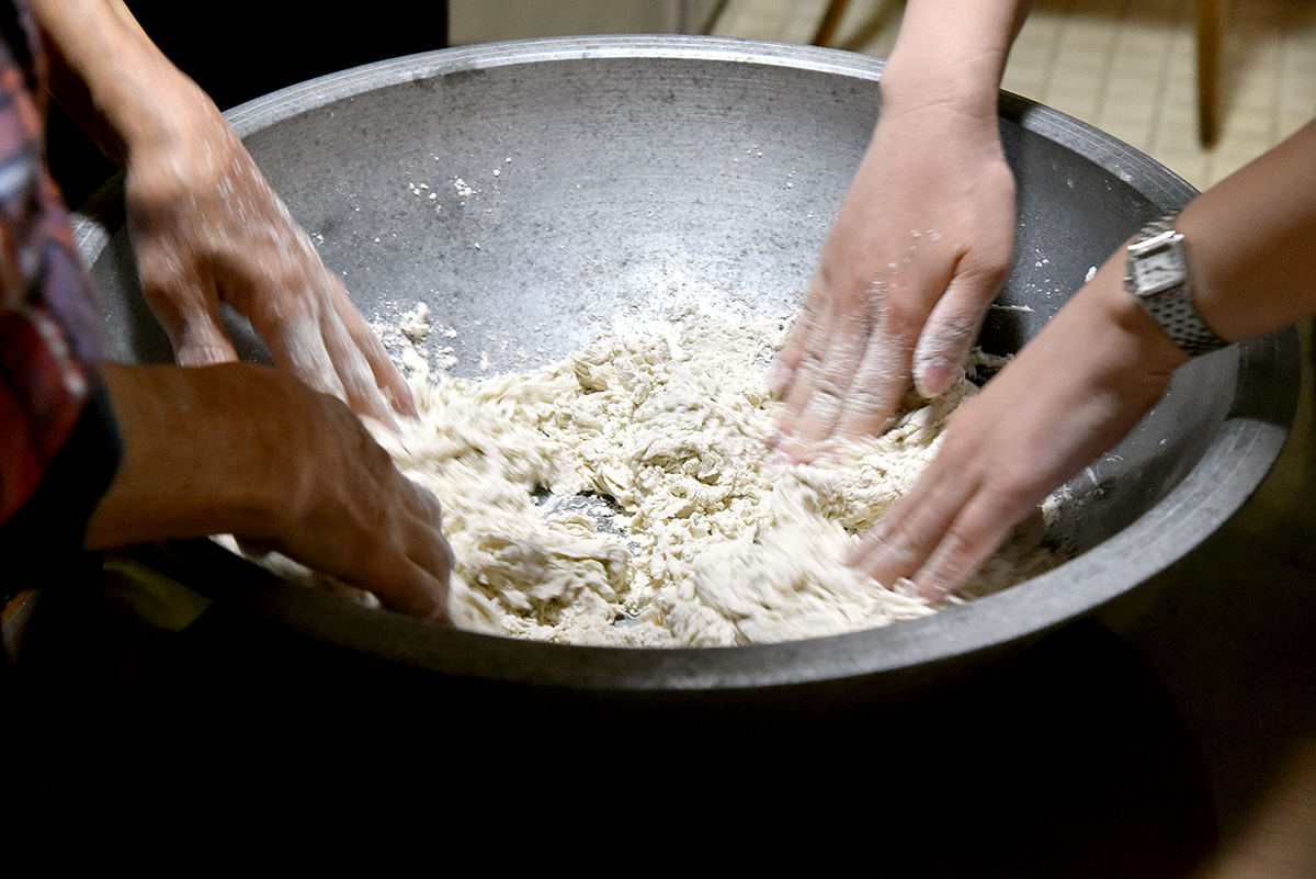 御殿場の郷土料理「みくりやそば」。みくりやそばは、そばのつなぎに水ではなく山芋や自然薯を使うのが特徴。麺台の上で生地をのばす「のし」や、包丁を使って麺にする「切り」など、各工程を教えてもらいながら仕上げていきます。