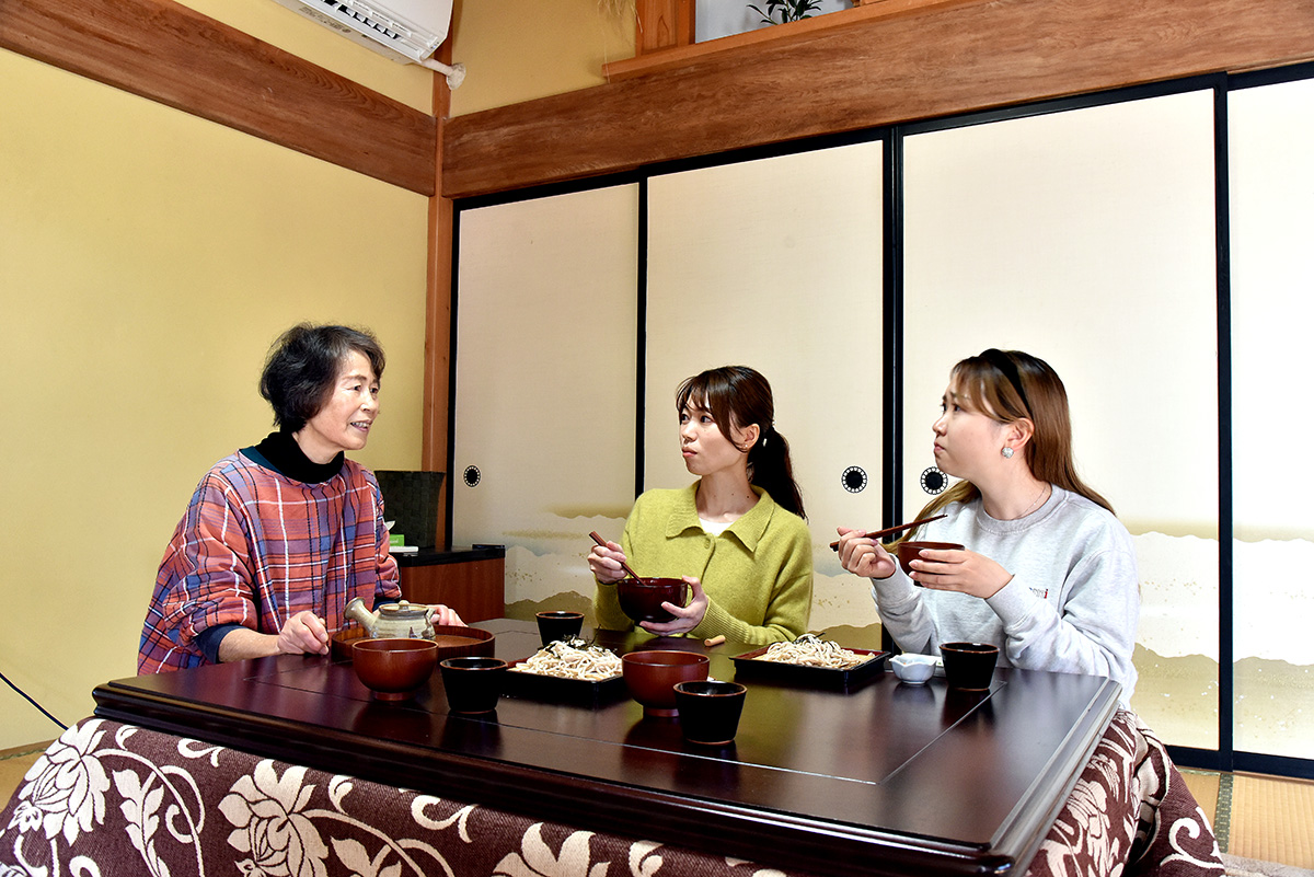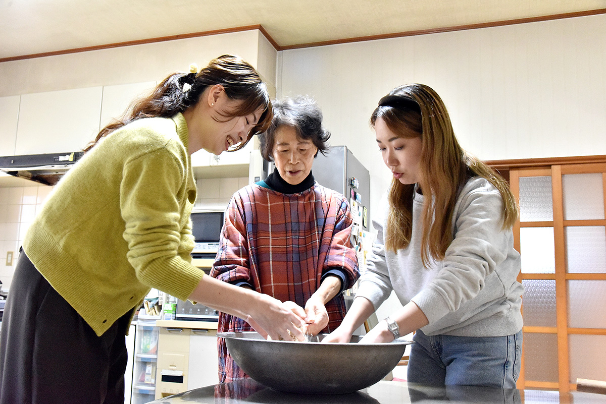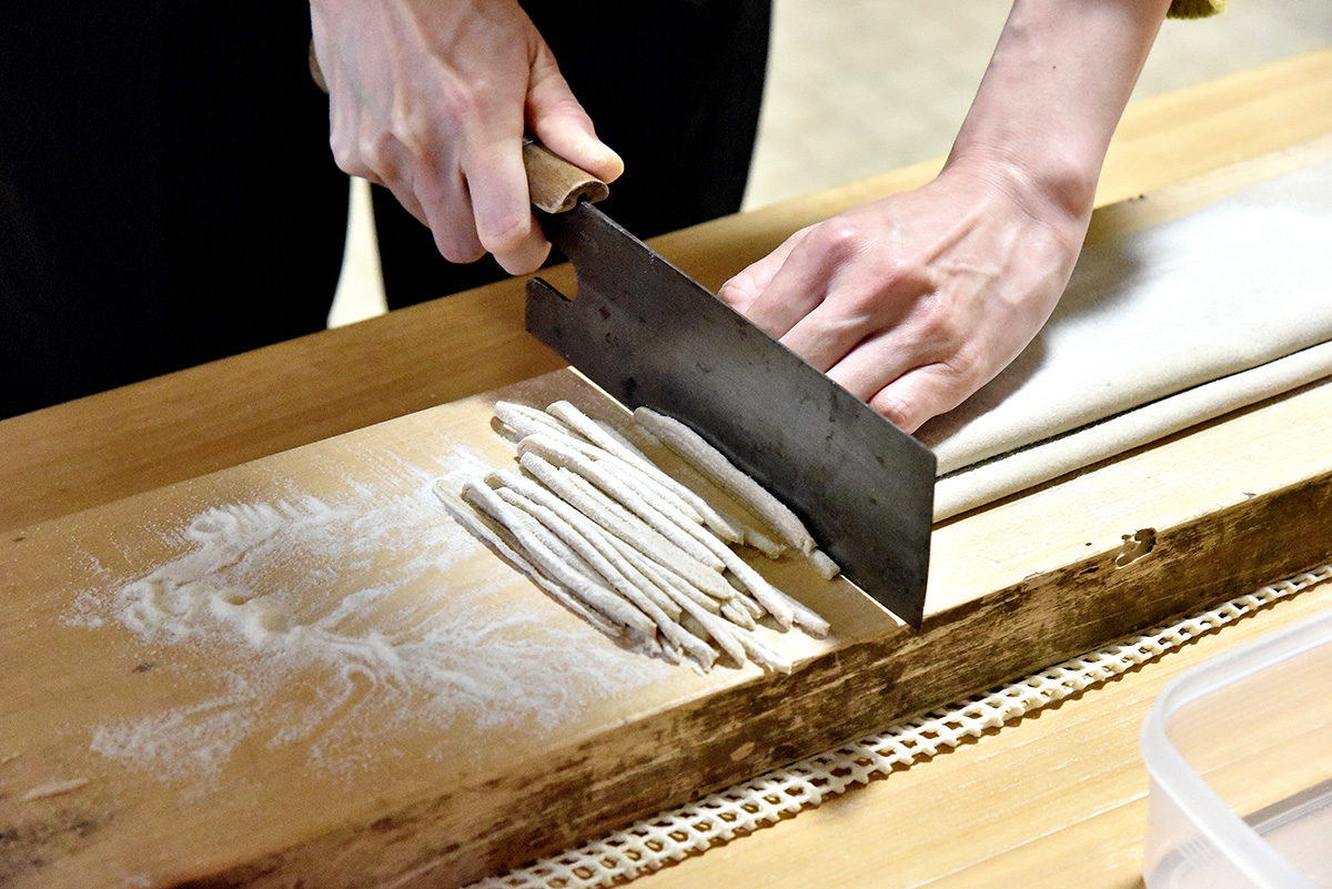 こんにゃくづくりや米粉を使ったお菓子づくりなど、宿泊者向けの体験プログラムがあり、中でも人気の体験がそば打ちです。