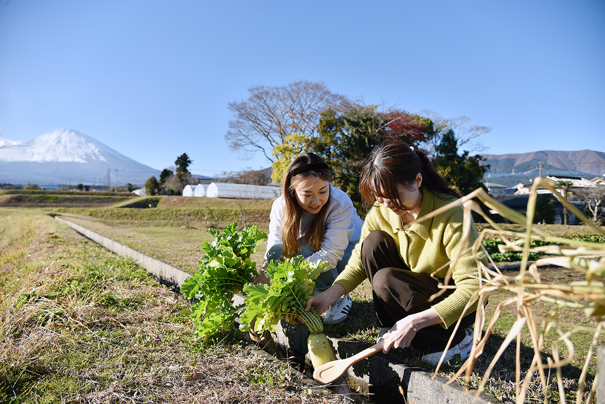 周囲を田畑に囲まれた農家民宿このはなは、季節の野菜収穫体験と採れたての新鮮野菜を使った調理体験が人気。晴れた日には宿に隣接する畑から雄大な富士山の景色を望めます。