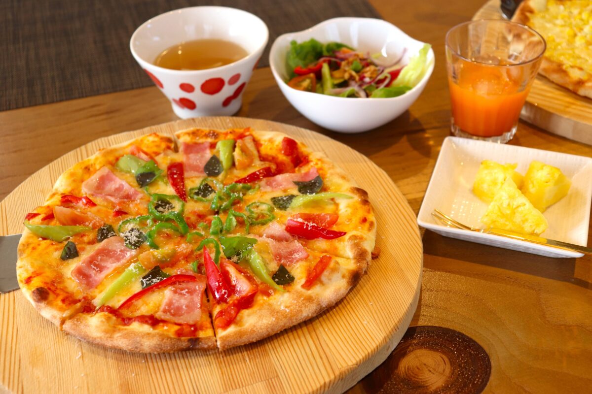 自家農園で採れた野菜がカラフルに彩るピザ、コーンマヨ、ハチミツなど、どれも焼きたてのピザが提供されます。農泊体験では、敷地内の自家農園の野菜収穫体験やシフォンケーキ作りがあります。