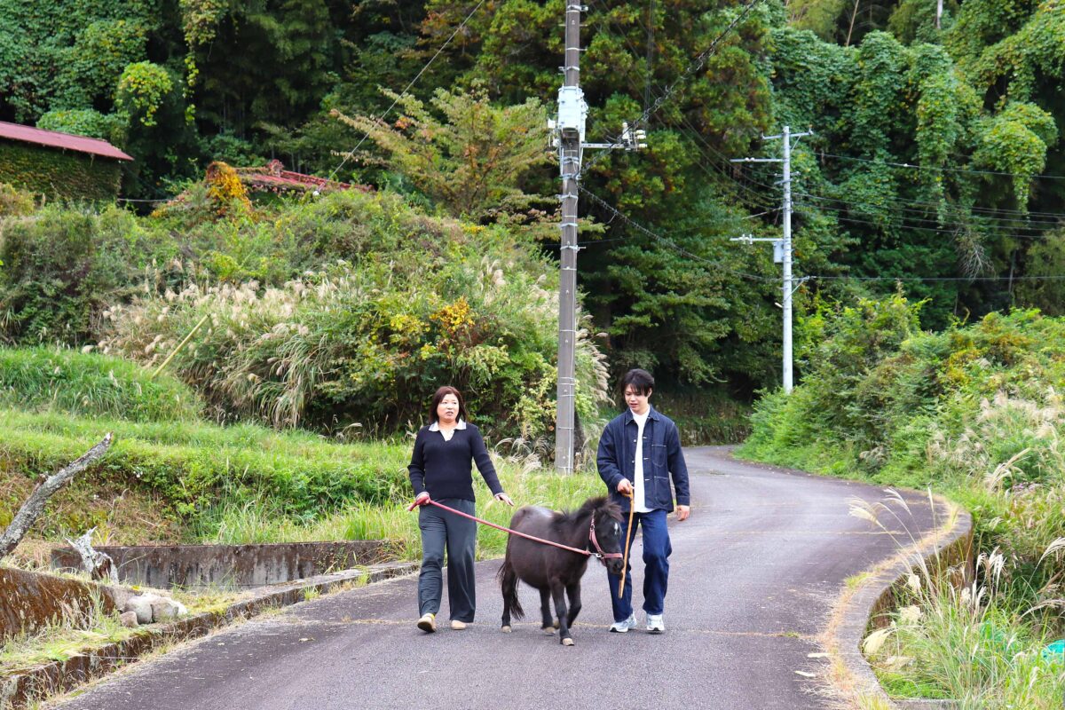 ミニチュアホースとの触れ合いにはエサやりや、オーナーと一緒に外へお散歩体験もあります。
