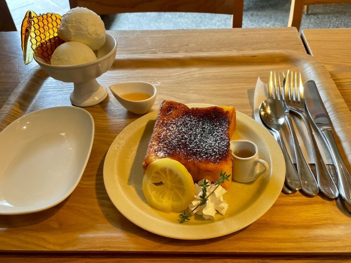 ひんやりしたフレンチトーストを食べてみたい!ということで、今回は特別にカフェメニューのひんやりブリュレフレンチトーストと自家製メレンゲアイスをいただきました。