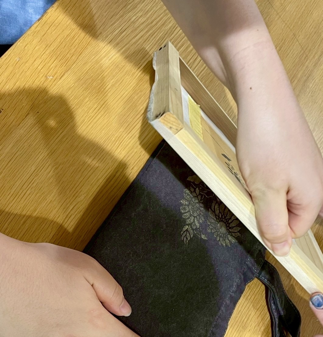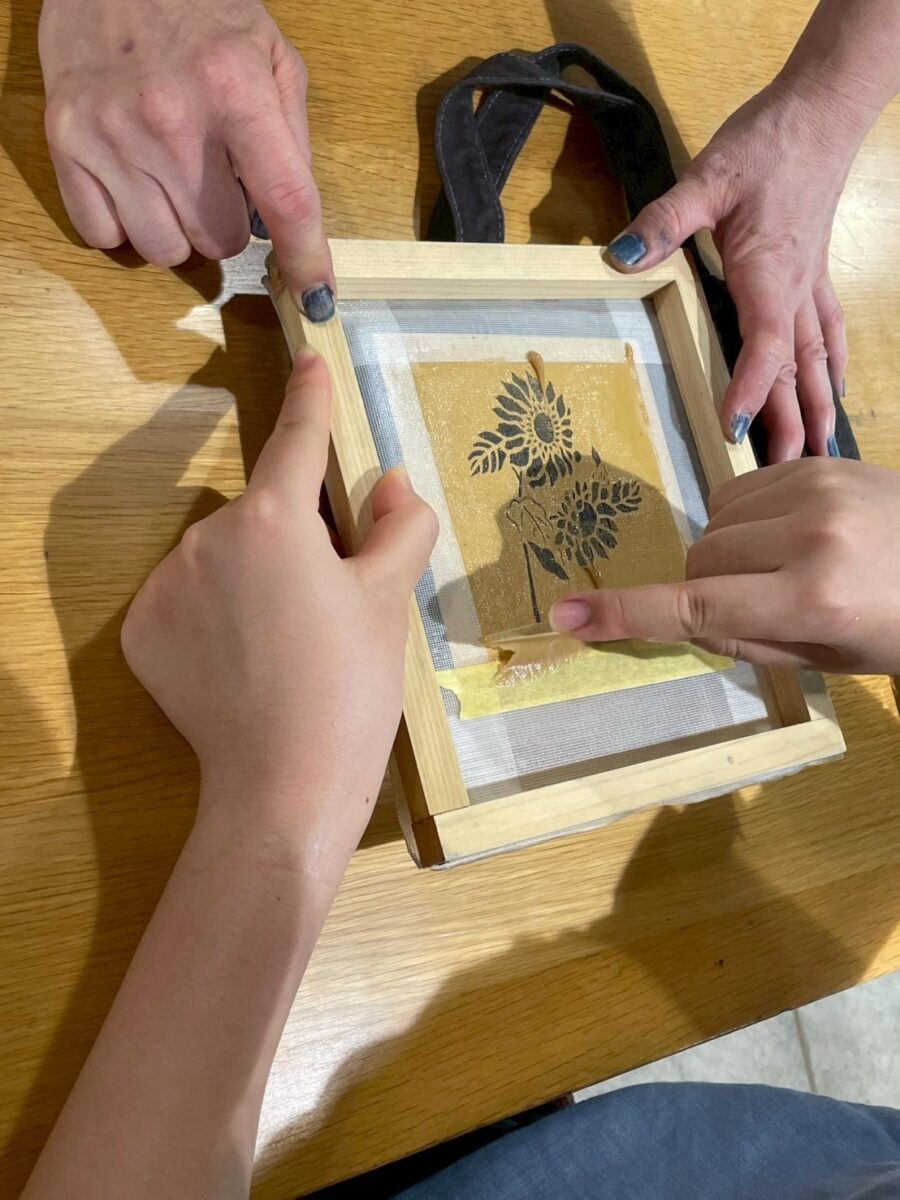 まずはサンプルの型から。私はひまわりの絵柄を選びました。トートバックの上に固定し、へらでチタンの糊を広げていきます。