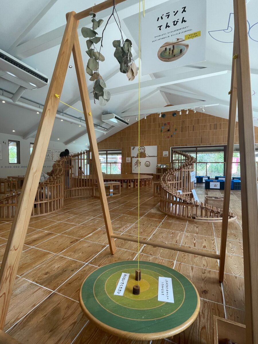 上から吊るされた丸い板の上に切り株を乗せていくバランスゲームや、階段部分に音階が異なる板をはめて、階段の上から球を転がすと音楽を演奏できる仕掛けなど、様々な遊びを楽しめます。