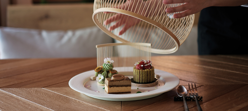 例えばデザートプレートの装飾のドームは、駿河竹千筋細工職人の作品が用いられています。駿河竹千筋細工が使用されていることにより、単なるケーキプレートではなく芸術作品のように感じますね!