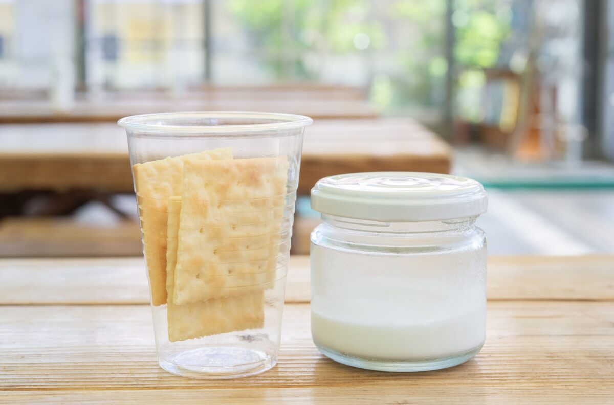 「丹那牛乳」の生クリームをビンに入れフリフリ。手作りでバターを作る体験です。