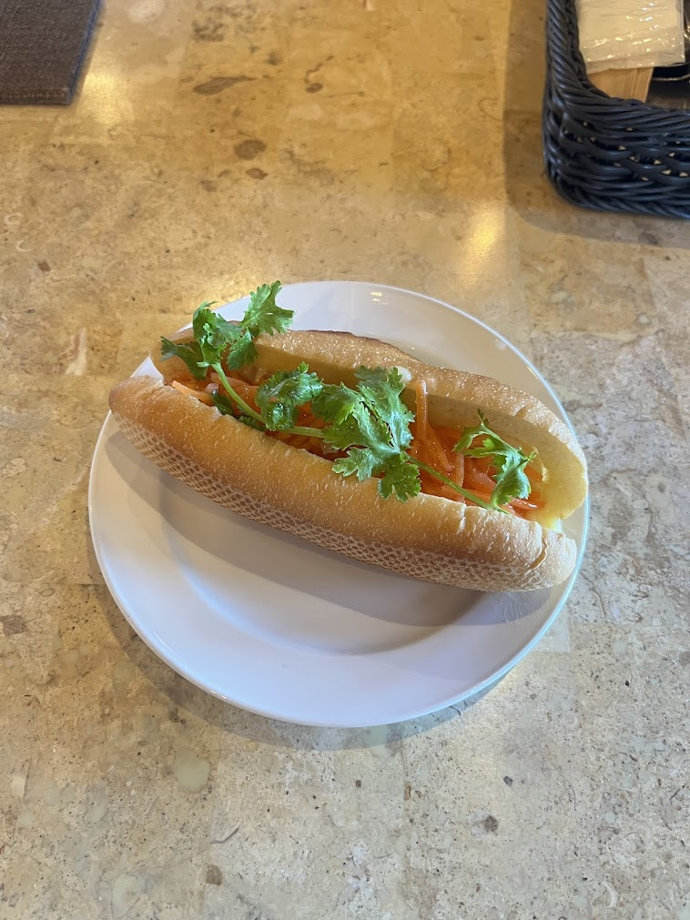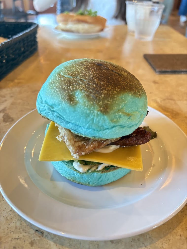 青いバンズにレモン、魚、チーズなどが挟まっていてとっても美味しかったです!