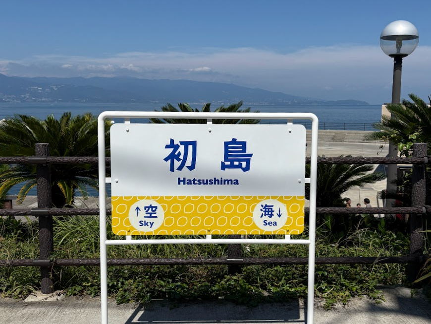 初島に到着して少し歩き、港と船が見える高台に初島の駅風の看板がありました!📸みなさんもまずはここで写真を撮ってみたらいかがですか?