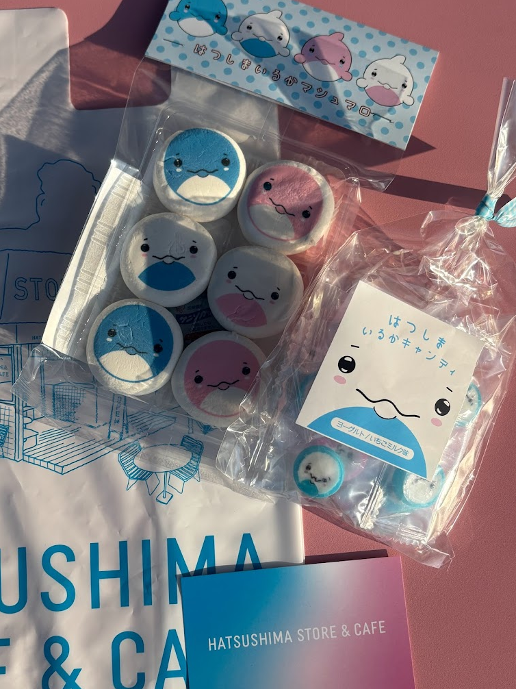 私たちは初島のキャラクター「はつしまいるか」がモチーフになったマシュマロとキャンディーを購入しました。キュートなはつしまいるかの顔にときめきました♪