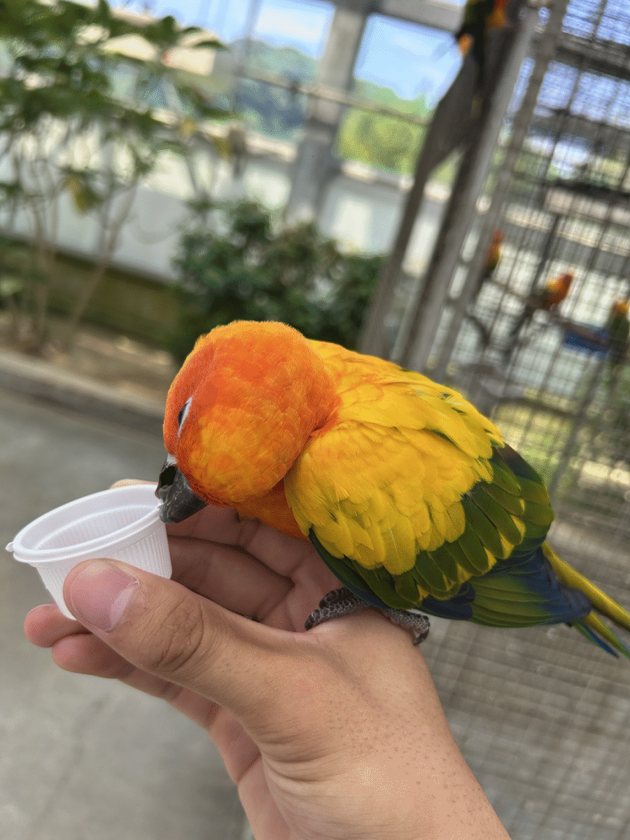 ここで注意すべきなのが、放鳥ゾーンの序盤に待ち構えているインコが思ったよりも自我が強いことです。一緒に来た子のことをぼうっと見ていると一瞬で餌をすべて取られます。少しでも近づく時間を長くしたかったら少しずつあげましょう。アピールも少しずつしていこう。
