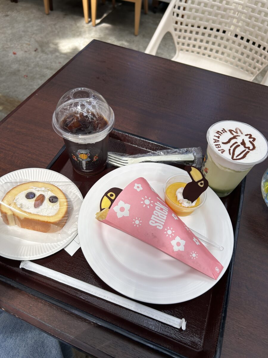 今回私達が頂いたのは、がっつり系のもの2つとスイーツ3つです。それらの中でのおすすめは掛川花鳥園オリジナルカフェラテですね。とても甘かったです。恋愛もこのぐらい甘ければいいのに。。。