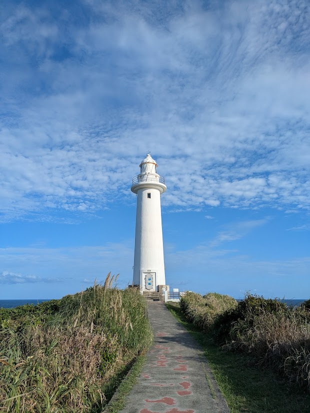 風を浴びながら最後に向かったのは一部のアニメ好きの中で話題の聖地である爪木崎公園、爪木崎灯台です。ここは2015年に放送された、某学園SFコメディアニメの一場面で登場した場所となっています。